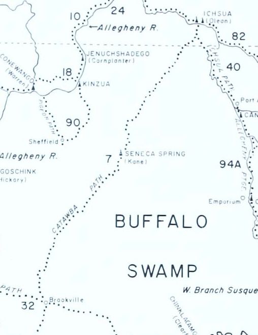 This is the good news: in the area of Northwestern Pennsylvania identified as Buffalo Swamp, particularly from Sigel, Jefferson County, Pennsylvania through Millstone and Highland Corners, Elk County, then through Kane (Seneca Spring), McKean County, then north through Bradford, Pennsylvania to Olean, New York, there is only one well documented, singularly identified path, which at one time was used primarily by Seneca Indians and known as the Catawba Path, later known as the Olean Trail, and which in 1822 became a part of the Olean Road.